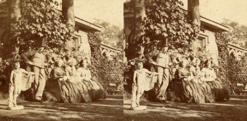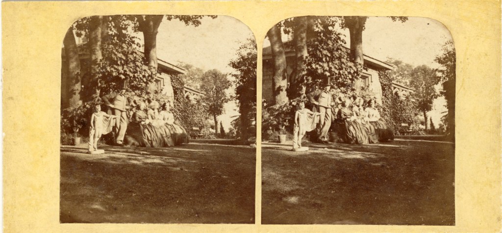 This late 1850s sequential stereoview shows a man in a stove pipe top hat and three women on a bench (and possibly a dog that has moved under the left of the bench) in the gardens of an elegant cottage. The rear identifies the location as Wooers’ Alley Cottage, Dunfermline.
